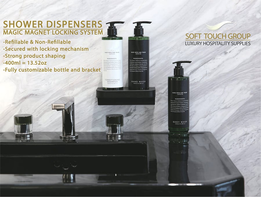 Luxury Hotel Shower Dispensers. Fully customizable, Eco-Friendly.